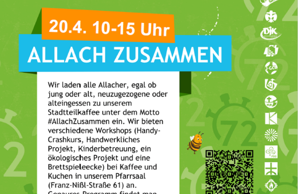 Wir laden alle Allacher, egal ob jung oder alt, neuzugezogene oder alteingesessene zu unserem Stadtteilkaffee unter dem Motto #AllachZusammen ein. Wir bieten verschiedene Workshops (Handy-Crashkurs, Handwerkliches Projekt, Kinderbetreuung, ein ökologisches Projekt und eine Brettspielecke) bei Kaffeee und Kuchen in unserem Pfarrsaal (Franz-Nißl-Straße 61) an. Genaueres Programm ist der News - Programmübersicht zu entnehmen.