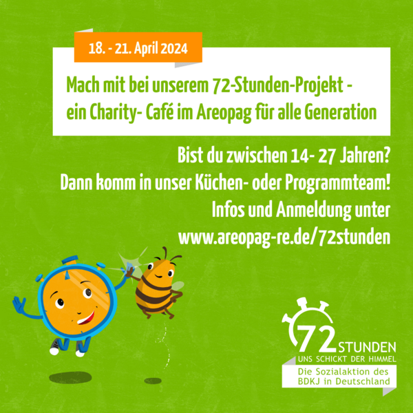 Wir möchten gerne allen, die Lust auf diese besondere Aktion haben, eine Teilnahme an der 72 Stunden-Aktion ermöglichen - und zwar mit und im Areopag. Mit unserer Projektidee - einem Charity-Café im Areopag - können wir gemeinsamen eine freudige und angenehme Zeit verbringen und nach euren Ideen und Wünschen das Charity- Café gestalten. Ziel ist es, dabei so viele Spenden wie möglich für soziale Projekte zusammen. Jede Idee ist da willkommen und wir entscheiden dann gemeinsam, was wir umsetzen können.