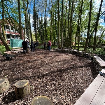 Aus alten Steinen werden zwei Sitzmauern für die Schüler:innen gebaut, inklusive eines Gerüsts für eine Tafel. Hier soll naturnahes Lernen im Freien stattfinden können. Dieses Areal soll nutzbar sein für andere Grundschulen, Kindergärten oder sonstige Gruppen.