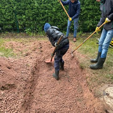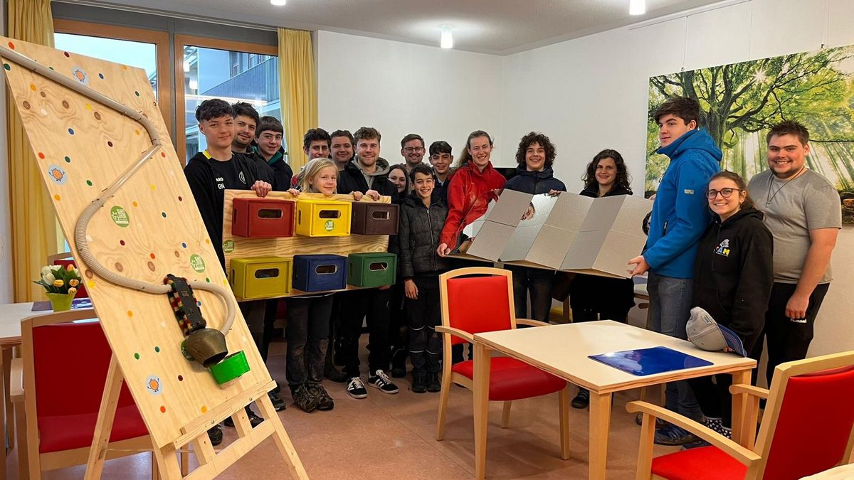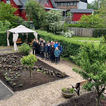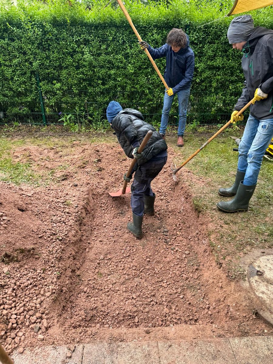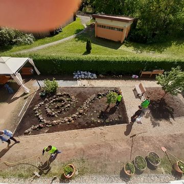 Diese Gruppe bedient gleich zwei Pflegeheime und baut Erlebniswände und Wege für die Senioren. Zum Demenzgarten gehören neben Elementen mit Kräutern zum riechen, Werkzeugen und verschiedenen Wegoberflächen auch eine kleine Bushaltestelle.