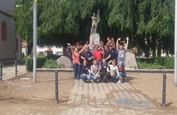 Anlegen eine Kleinkinderspielplatzes mit Balancierbalken, Barfußpfad, Sitzgelegenheiten, Bäume pflanzen und Insektenhotel