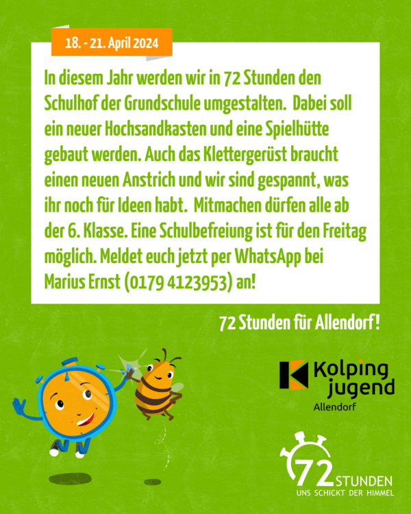 Alle Allendorfer sind zur Wort-Gottes-Feier zum Abschluss der 72-Stunden-Aktion am 21. April um 14 Uhr herzlich eingeladen! Die Wort-Gottes-Feier findet auf dem Schulhof statt.