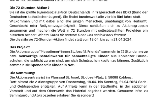 Wir sammeln in 72 Stunden neuwertige Schreibwaren für benachteiligte Grundschüler in Koblenz und Geldspenden für Kinder in Not!
