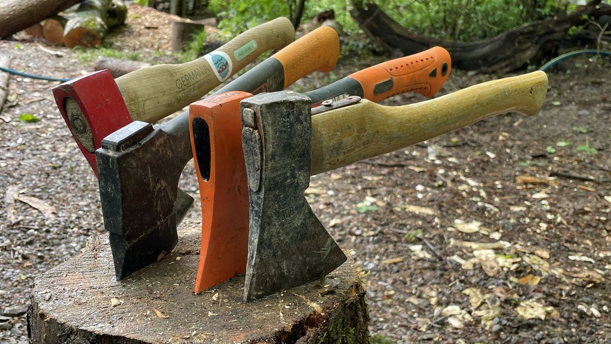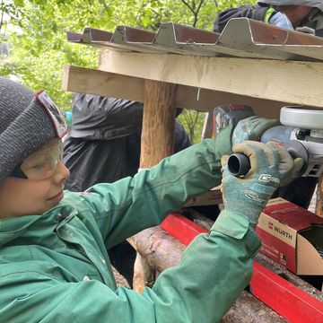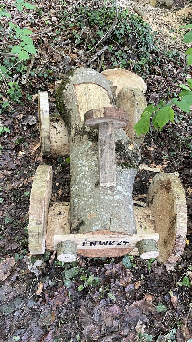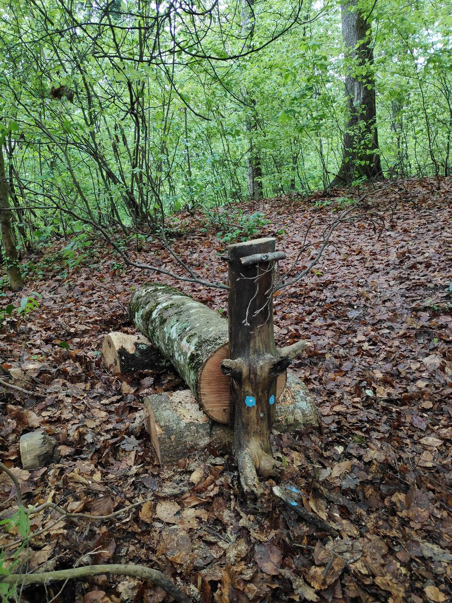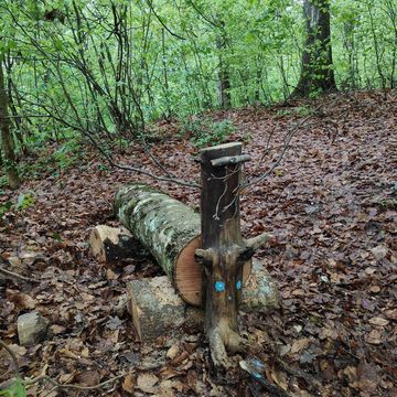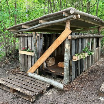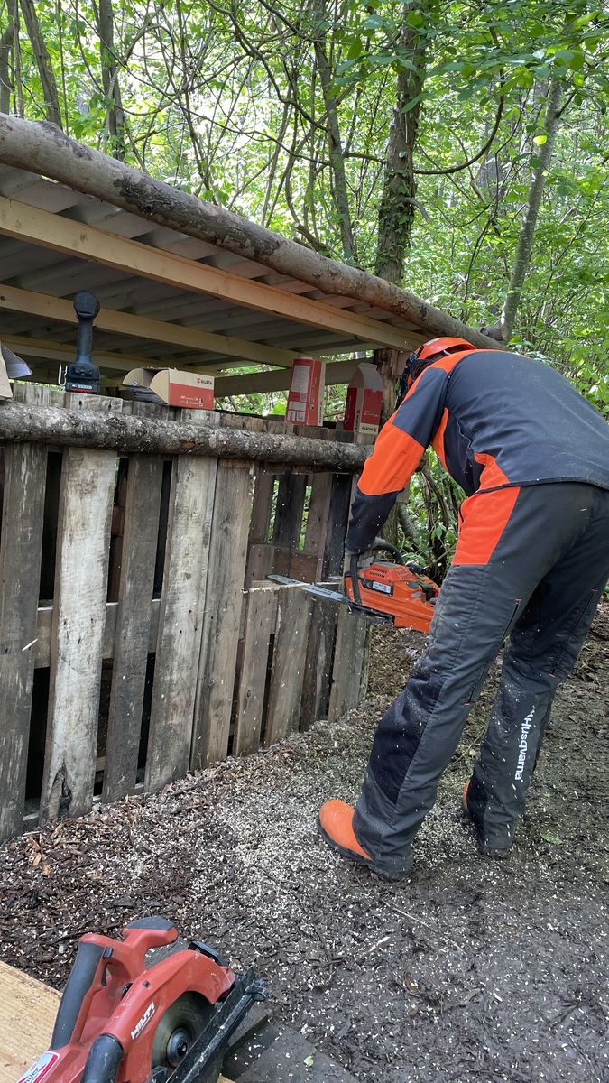 Errichtung eines Holzhäuschens und Aufstellen kleiner Waldtiere aus Holzstämmen