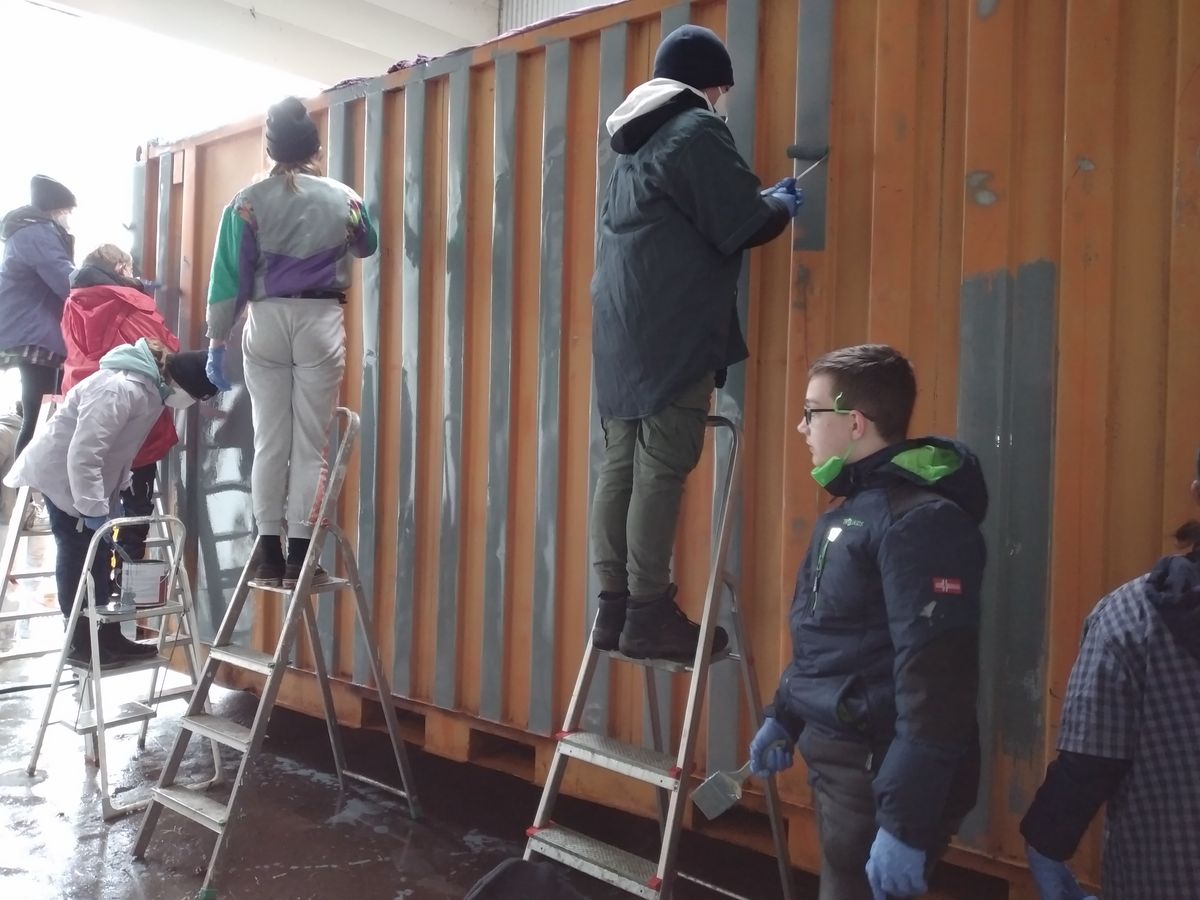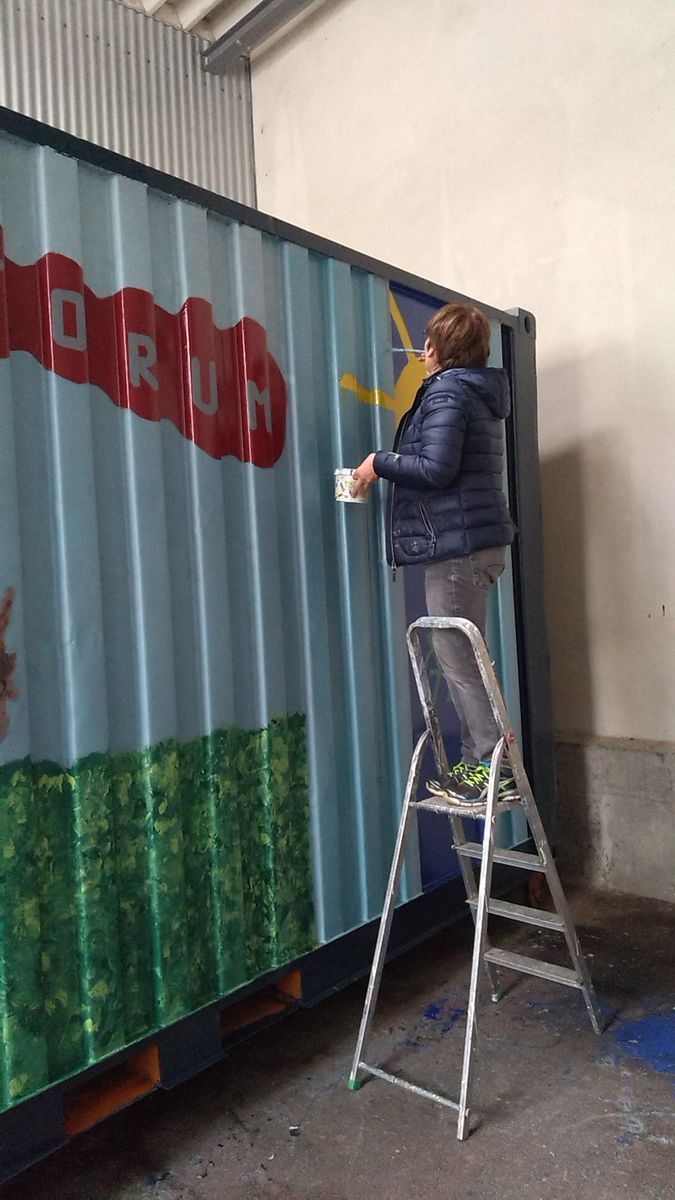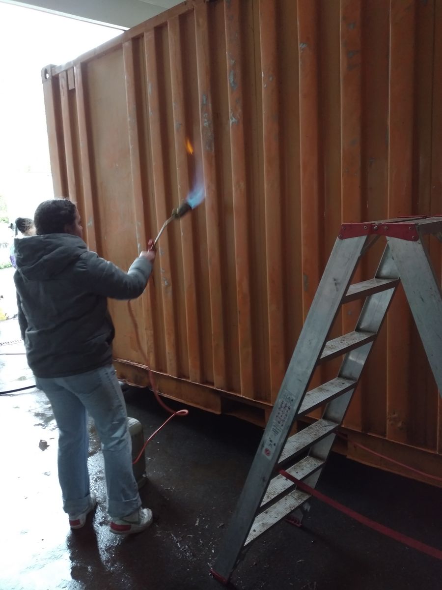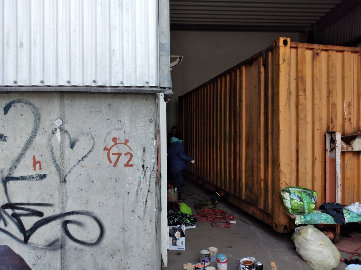 Der Container muss geschliffen, lackiert und bemalt werden.
