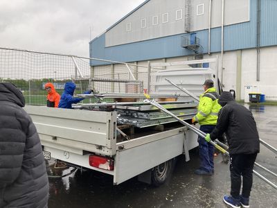 Trotz Regens war das Frühstück kurz. Die erste Lieferung war schon kurz nach halb 9 auf dem Bauplatz. Trotz Regens war die Gruppe schnell da und hat das Gerüst abgeladen. Selbst die jüngsten waren tatkräftig mit dabei. Dank an die Firma Alfix die uns das Gerüst kostenfrei zur Verfügung gestellt haben. So sind wir sicher