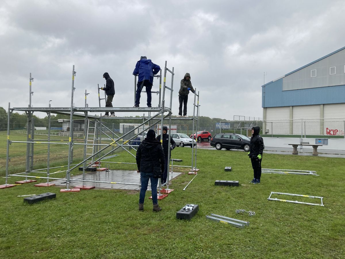 Schnell wurden die drei Seiten des Gerüsts gestellt. Dann waren stoppten die Erwachsenen den Aufbau damit wir die Pfosten schneller und leichter stellen können. Ach wie blöd dass alle frühzeitig zum Essen und zum trocknen ins Gemeindezentrum geschickt wurden.