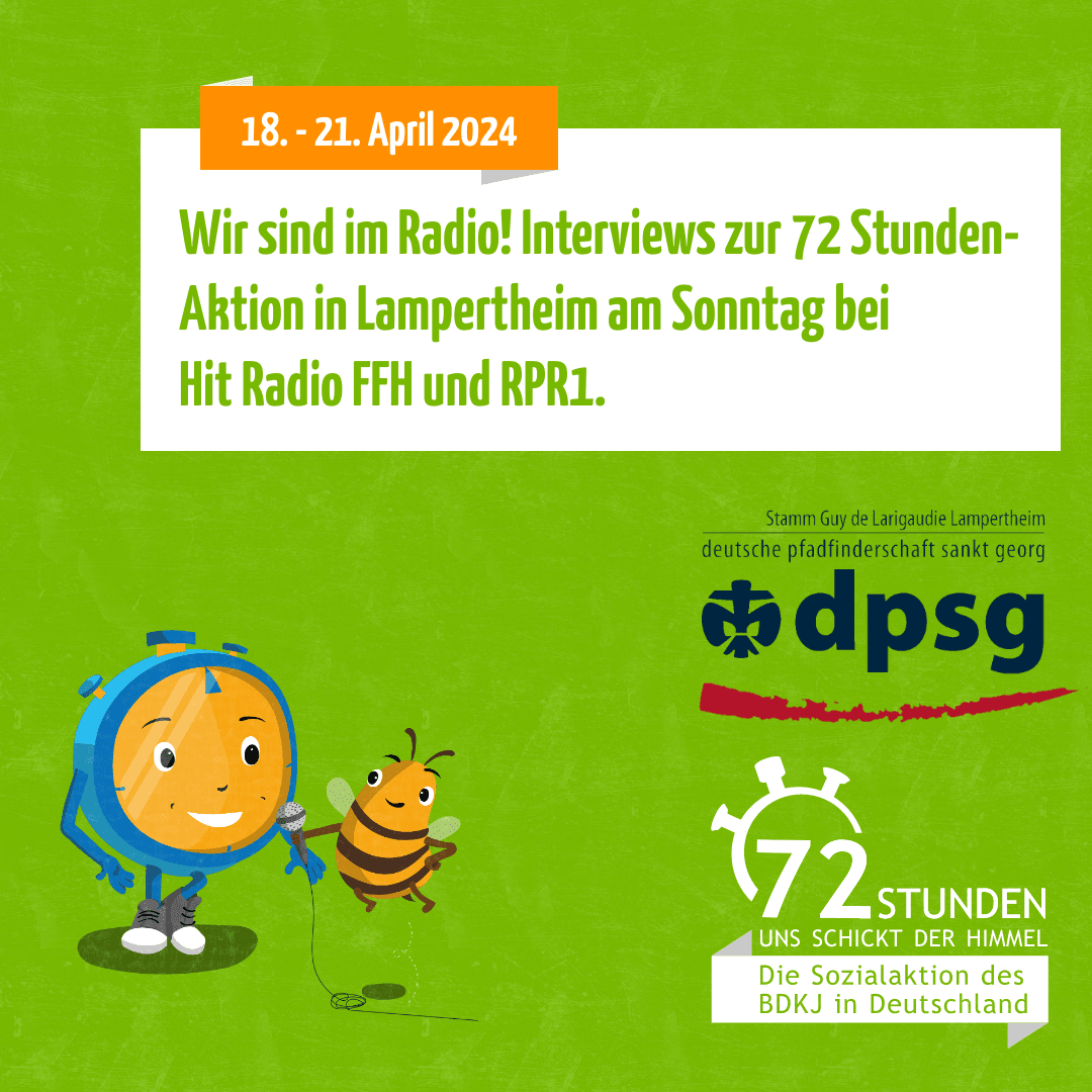 Am Sonntag lohnt es sich das Radio einzuschalten und Hit Radio FFH oder RPR1 zu hören! Wir wurden zu der 72 Stunden-Aktion in Lampertheim mit unseren Erlebnissen und Erfahrungen interviewt. Erzählt haben wir über die vergangenen Aktionen sowie über die Herausforderungen der Get-it Variante, also die Aufgabe zur 72 Stunden-Aktion erst zum Start dieser zu erhalten.