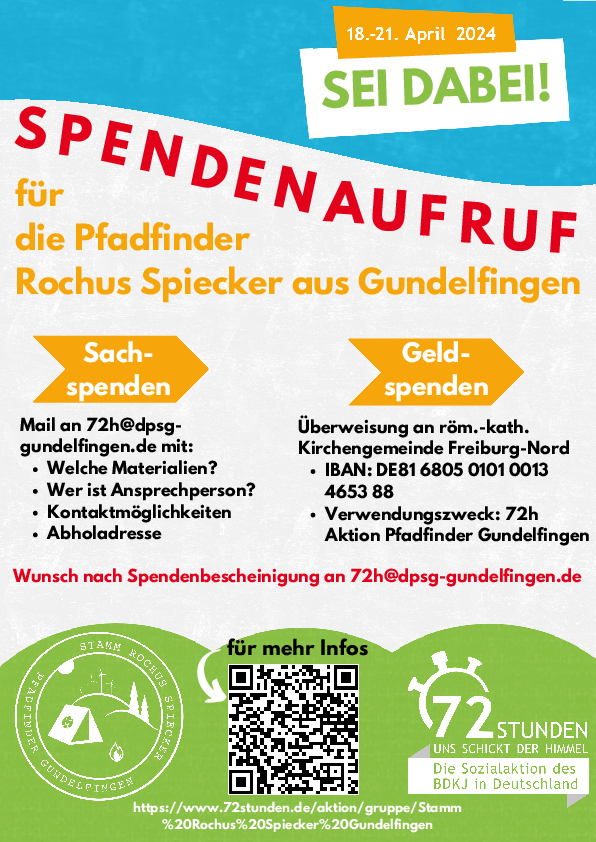 Wir, der Pfadfinderstamm Rochus Spiecker Gundelfingen, nehmen mit ca. 50 Personen an der Aktion teil! Wir erfahren erst am 18.04. unser Überraschungs-Projekt und sind auf Deine & Ihre Mithilfe angewiesen: Wir benötigen Sach- & Materialspenden, um unser Projekt umsetzen zu können. Sowohl bei Sach- als auch bei Geldspenden können wir eine Spendenbescheinigung ausstellen - eine kurze Mail an 72h@dpsg-gundelfingen.de reicht schon aus.