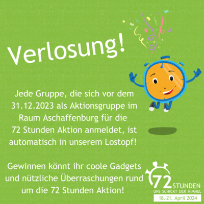 Jede Gruppe, die sich vor dem 31.12.2023 als Aktionsgruppe im Raum Aschaffenburg für die 72 Stunden Aktion anmeldet, ist automatisch in unserem Lostopf!