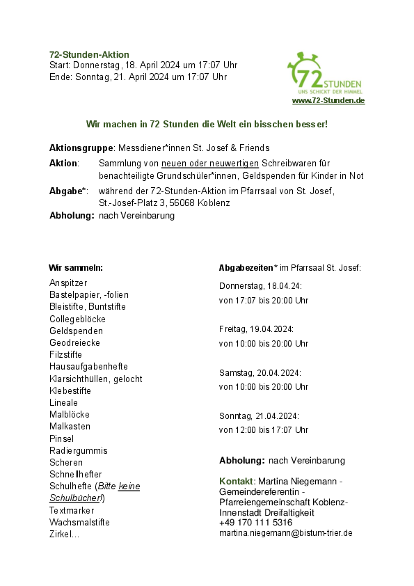 Die Messdiener*innen St. Josef & Friends sammeln neue und neuwertige Schreibwaren von A wie Anspitzer bis Z wie Zirkel!