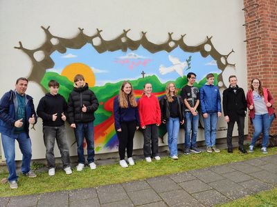 Trotz schlechten Wetter, wir haben 330 Euro durch den Kuchenverkauf erwirtschaftet und das Graffiti erfolgreich an die Wand des Gemeindezentrums angebracht! Applaus!