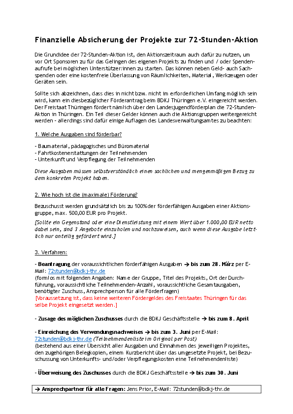 Solltet ihr noch weitere finanzielle Mittel neben Spenden oder Unterstützungen benötigen, haben wir euch einige wichtige Aspekte herausgesucht, die ihr bei der finanziellen Förderung eurer Aktion über den BDKJ beachten müsst. Das Schreiben hierzu findet ihr im Anhang.