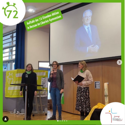 Heute erfolgte der Auftakt der ökomenischen 72-Stunden-Aktion in Mitteldeutschland im Liborius-Gymnasium Dessau. Die dortigen Gruppen stellten ihre Projekte vor, bekamen den Segen der Landespfarrerin der Landeskirche Anhalts Peggy Rotter. Bischof Gerhard Feige und der Schirmherr der Aktion, Ministerpräsident Reiner Haseloff, gaben mit ihren Worten zur Begrüßung viel Motivation zum Start der Aktion an die Kinder und Jugendlichen weiter.