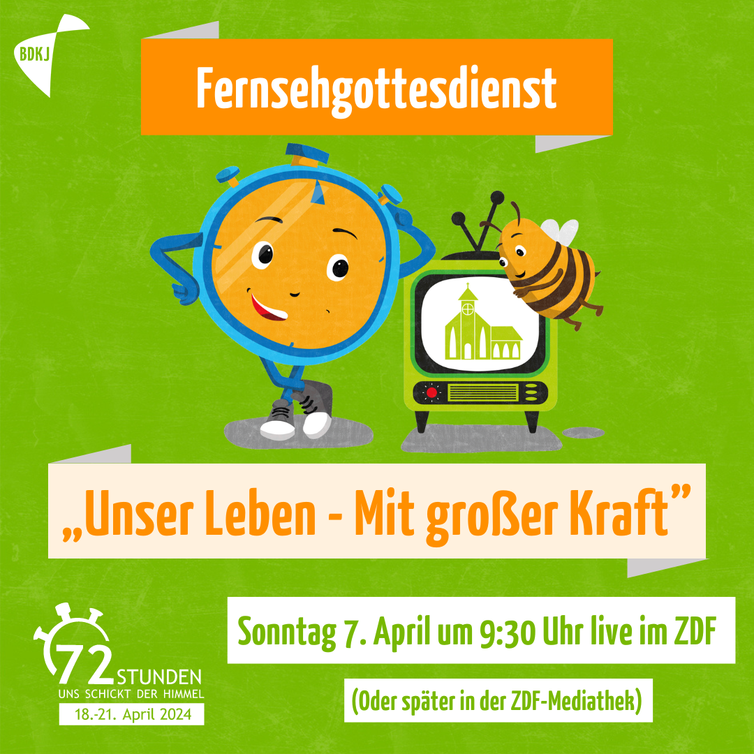 Am 7. April 2024 übertrug das ZDF um 9:30 Uhr einen besonderen Fernsehgottesdienst aus der OT Josefshaus in Aachen. Anlass war die 72-Stunden-Aktion. Unter dem Titel „Unser Leben – mit großer Kraft“ gingen BDKJ-Bundespräses Stefan Ottersbach und PSG-Diözesankuratin Katharina Rexing gemeinsam mit den Mitfeiernden der Frage nach, wie die Kraft des Osterfestes auch heute noch wirkt.